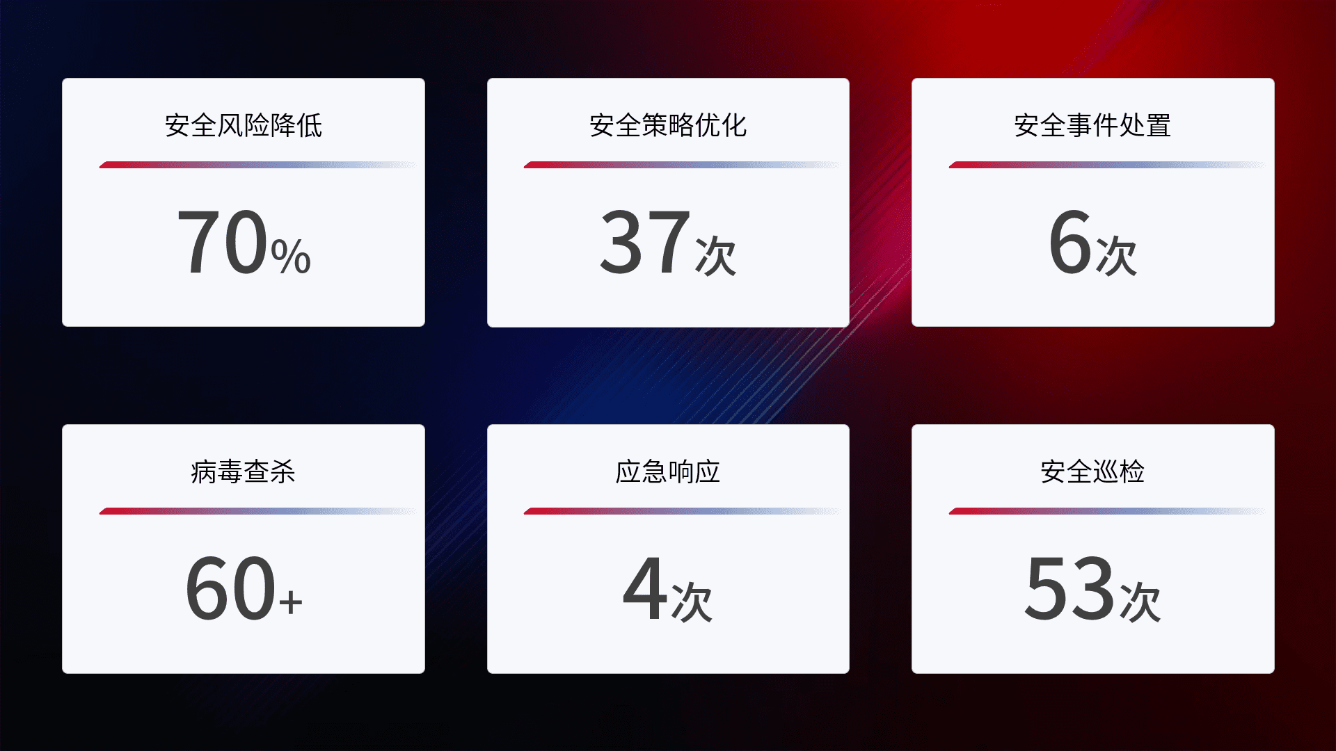 提供全面的安全事件报告体系,,,包括处置报告、、、周报、、季度和年度总结,,结合持续监控,,,,帮助客户深入了解网络安全状况。。。。